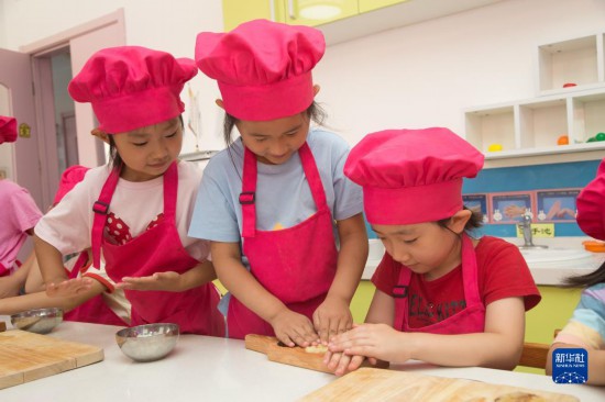 9月8日,北京门头沟妙峰山民族学校附属幼儿园的孩子们在制作月饼。