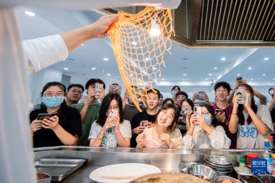 9月9日,邹志平在《中国名菜鉴赏》课堂上向同学们展示用胡萝卜制作的网。
