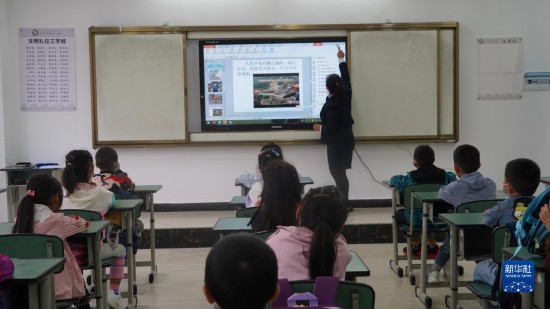 9月14日,老师在泸定县二郎山片区寄宿制学校给学生讲述抗震救灾情况。