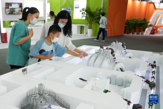 9月17日,在2022年全国大众创业万众创新活动周合肥主会场的主题展区,家长带着孩子参观超导回旋质子治疗系统模型。