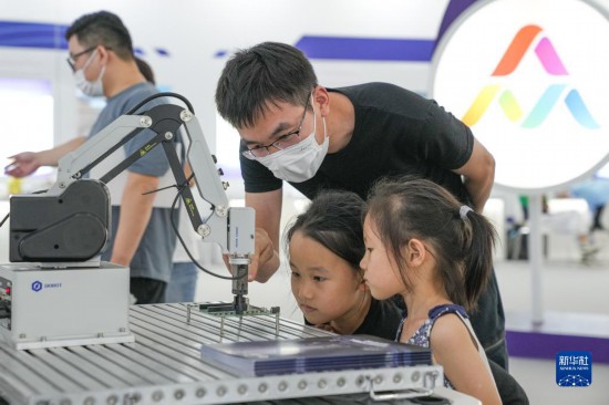 9月17日,在2022年全国大众创业万众创新活动周合肥主会场的主题展区,家长带着孩子参观智能协作机械臂。