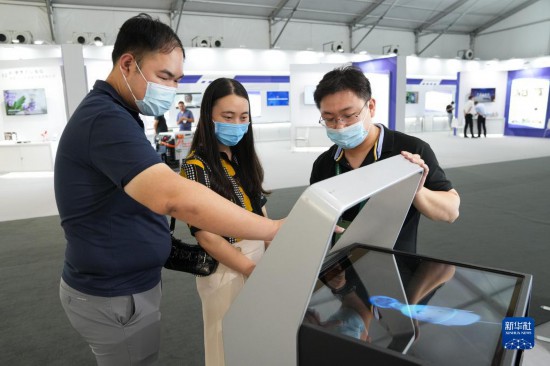 9月17日,在2022年全国大众创业万众创新活动周合肥主会场的主题展区,参观者体验无介质全息成像技术应用。