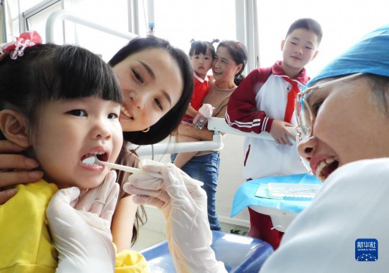 9月19日,在四川省达州市人民广场“外卖快递小哥暖心之家”,市中心医院口腔科医生在为一名小朋友检查牙齿。