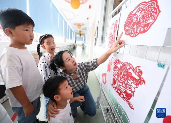 9月20日,老师在给孩子们介绍以中国农民丰收节为主题的校园剪纸作品。