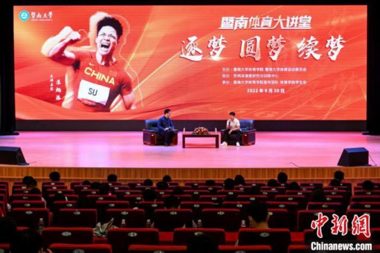 9月30日下午,暨南体育大讲堂主题讲座“逐梦 圆梦 续梦”在暨南大学大礼堂举行,亚洲飞人、暨大体育学院教授苏炳添开讲,与暨大师生、暨大附属中学和小学学生代表分享其运动生涯的心路历程。