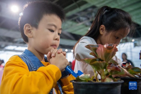 10月5日,在天华百卉园内,小朋友在学习种植技巧。