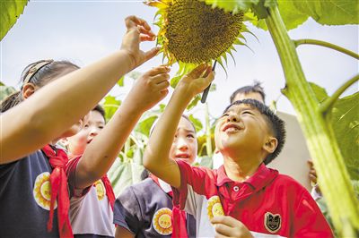 在重庆两江新区星湖学校教学楼顶的向日葵园,学生们在向日葵全融合趣评嘉年华测评中采集向日葵标本。 新华社记者 黄伟摄