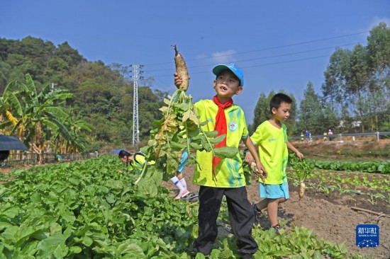 时下,广西南宁进入收获季节,当地一些孩子趁着周末走进田间地头,学习农事,体验丰收的喜悦。