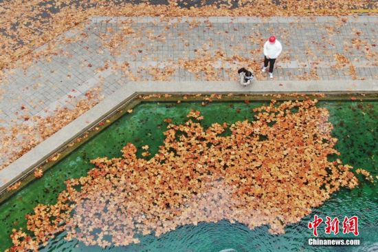 东南大学四牌楼校区大礼堂前池塘内飘满落叶。(无人机照片) 中新社记者 泱波 摄