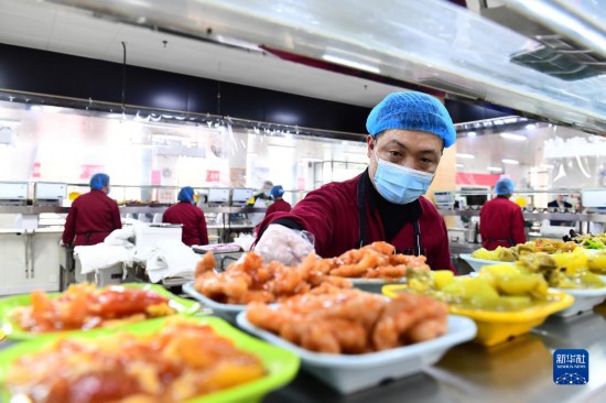 11月16日,在济南第三中学餐厅,工作人员在备餐。