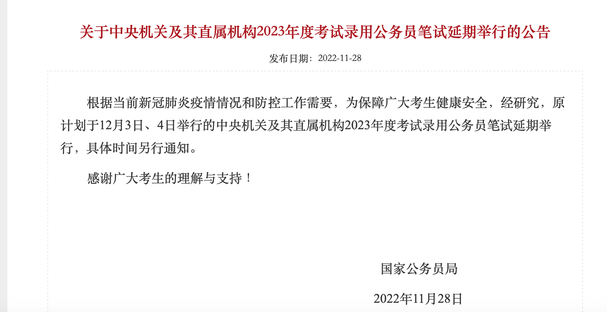 中央机关及其直属机构2023年度考试录用公务员笔试延期举行