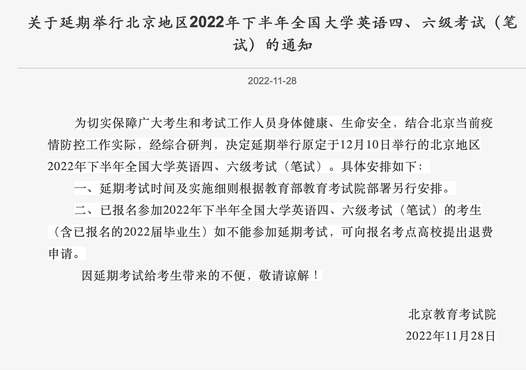 北京教育考试院通知指出,已报名参加2022年下半年全国大学英语四、六级考试(笔试)的考生(含已报名的2022届毕业生)如不能参加延期考试,可向报名考点高校提出退费申请。