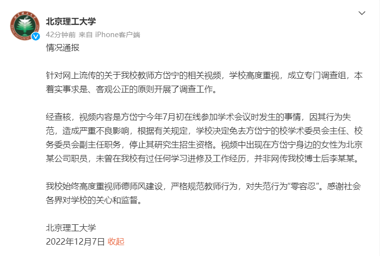 北京理工大学通报“学校教师方岱宁相关视频”处理结果