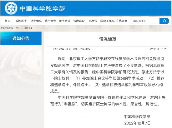 原标题:中国科学院学部:停止北京理工大学方岱宁部分院士权利