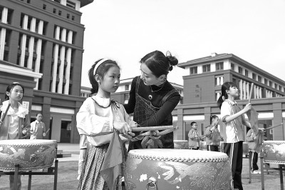 自“双减”政策实施以来,安徽多地学校开展劳动教育与实践、艺术类、体育类、益智类等种类多样的课后服务活动。小学老师在指导学生击鼓。新华社发