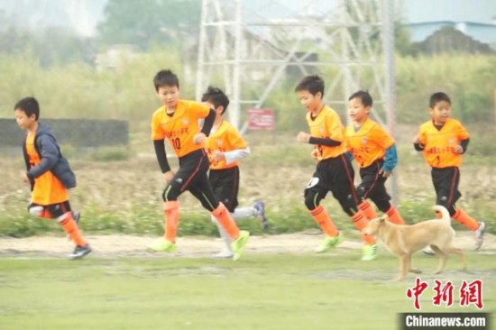 早晨,孩子们在足球场内跑步,一只小黄狗紧紧跟随。 刘俊聪 摄
