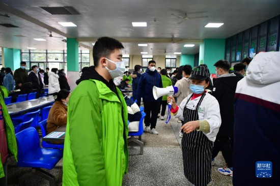 12月12日,在重庆市铁路中学校的食堂内,复课学生在食堂工作人员的引导下有序排队打饭。