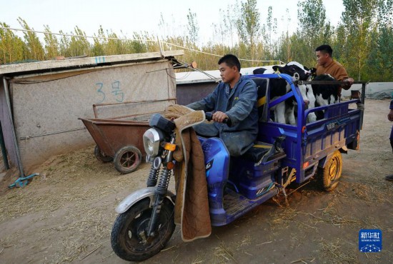 2022年10月19日,程鹏飞(左)和工人一起将刚买来的牛犊运到牛舍。