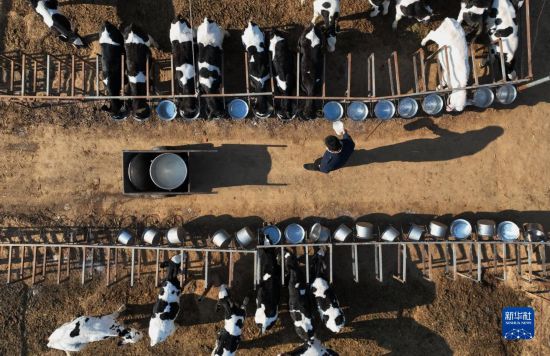 12月28日,程鹏飞在牛舍喂牛(无人机照片)。
