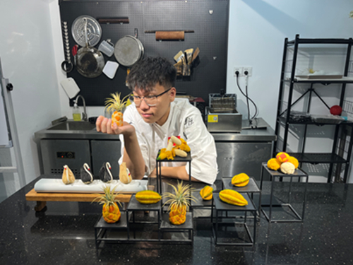 后来在大学里,陈小东接触到了其它菜系,包括中餐、西餐和中点、西点,遇到了自己想要深耕的方向——稣点制作。一开始,学校里教稣点的老师认为他的身体条件不适合做这个,“180的大个子,大手大脚,很难做精细活儿。”但是由于真的很感兴趣,陈小东没有轻易放弃,而是决定克服硬性条件苦练捏面技艺。因为他觉得,热爱的事情就要把它做好,而且不光要知道怎么做,还要“知其然,知其所以然”。