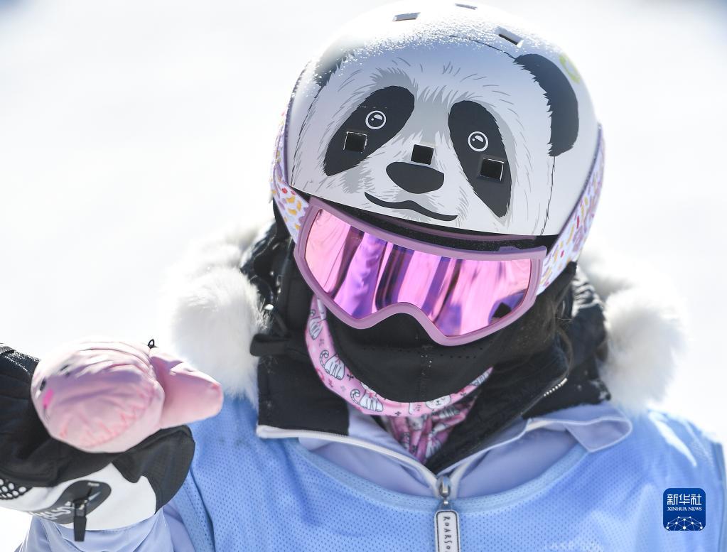 1月15日,一位小朋友滑雪时头戴熊猫纹饰的头盔。