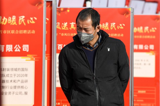1月11日,2023年“创响江苏”春风行动联合招聘会在南京市浦口区举行。图为一名求职者在招聘会现场查看招聘信息。 新华社记者 李博 摄