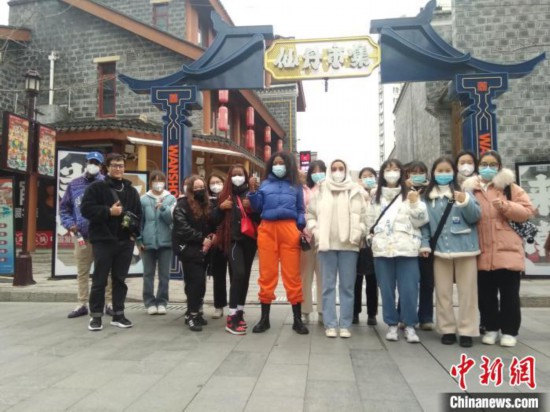 在该街区游客中心前广场,平安树、幸福树等寓意吉祥美好的近50种花卉争奇斗艳,留学生们争相拍照打卡。