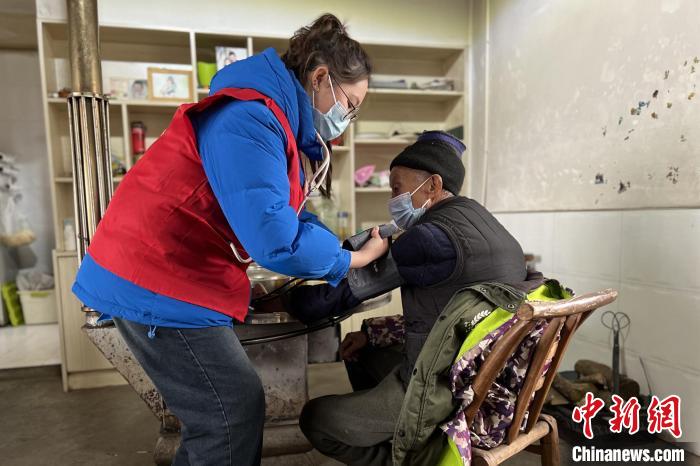 卢丹妮定期上门为包保户测量血压。 郭晓莹 摄