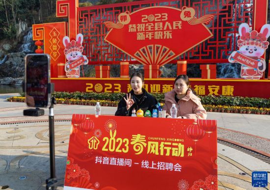 1月29日,用人单位在湖北省宜昌市秭归县的新春人才招聘会上进行直播,线上介绍岗位信息。