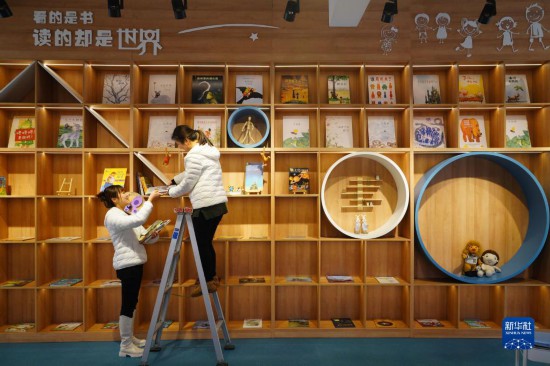 1月31日,在重庆市北碚区一家幼儿园,两名教师在整理校园读书角。