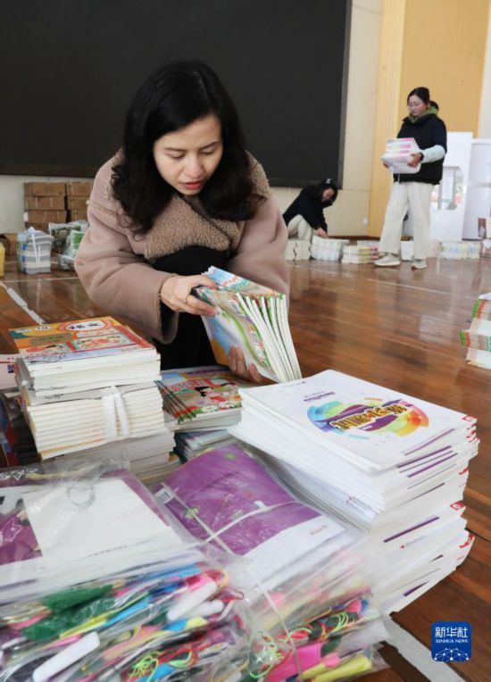 2月1日,江苏苏州东中市实验小学校的老师在整理新书。