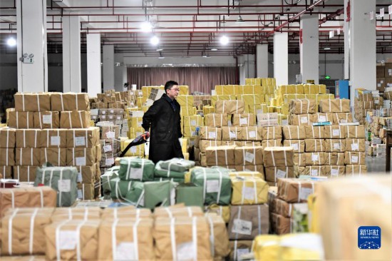 1月31日,在湖南省郴州市万信达工业园新华书店仓储中心,工作人员在搬运教材。