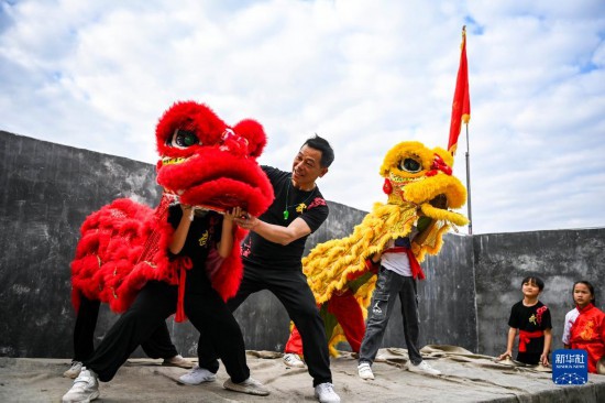 2月2日,在广西兴业县石南镇东周村,教练在传授舞狮的基本功。