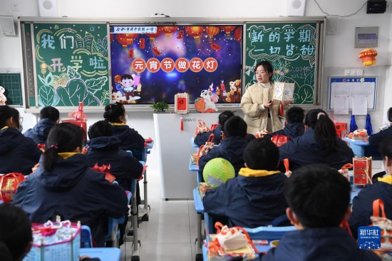 2月5日,合肥市建平实验小学南艳分校老师向学生介绍元宵节花灯的制作方法。