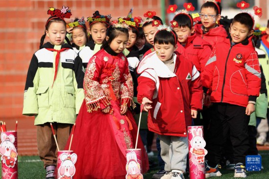 2月5日,在合肥市少儿艺术学校,孩子们参加“掷剑”游戏。