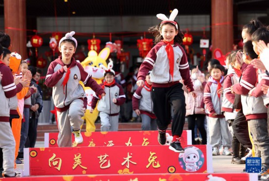 2月5日,在合肥市和平小学,孩子们参加“趣味跨栏”游戏。