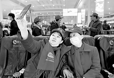 云南畅通返岗就业通道。图为两名务工人员在昆明南站候车厅候车时拍照。新华社发