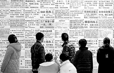 外来务工者在浙江省诸暨市大唐街道劳动力市场内查看招工信息。新华社发