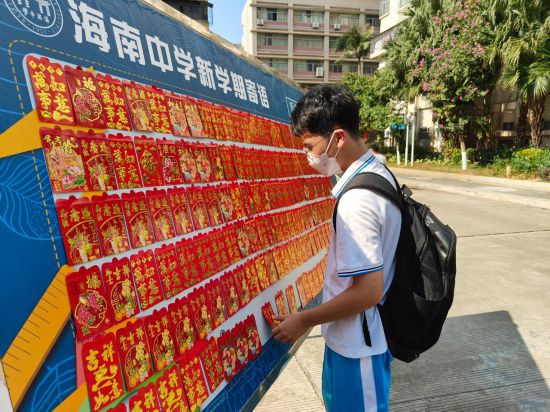 图为海南中学初中部一名同学在“红包墙”前摘取祝福“红包”。(图为受访单位提供)