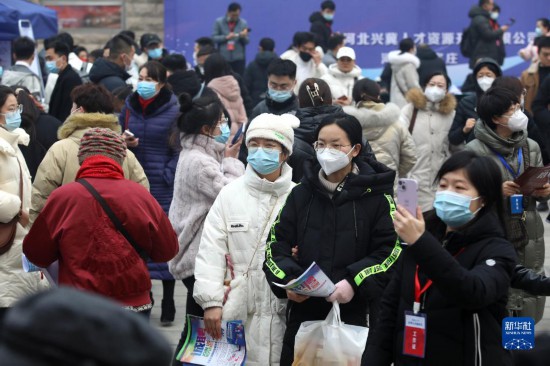 2月18日,在河北省艺术中心文化广场,求职者在招聘活动现场寻找工作机会。