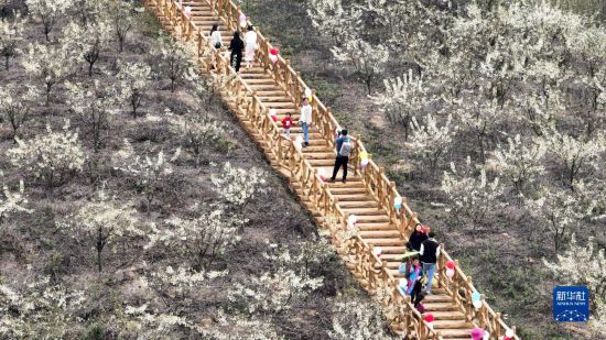 2月18日,游客在广西柳州市鹿寨县导江乡山楂林中赏花休闲(无人机照片)。