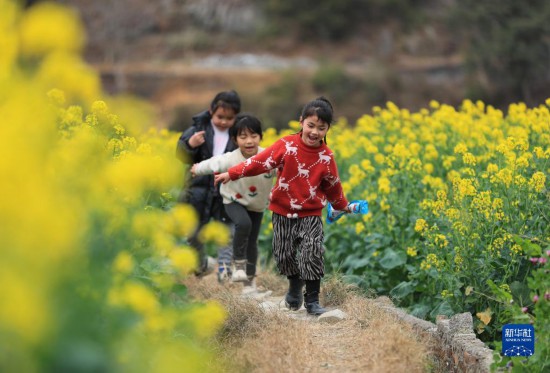 2月19日,小朋友在贵州省从江县洛香镇上皮林村的油菜花田间玩耍。