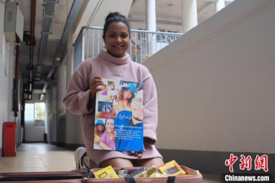 图为斯里兰卡籍留学生张安妮正在展示自己行李箱中家人的照片。刘俊聪 摄