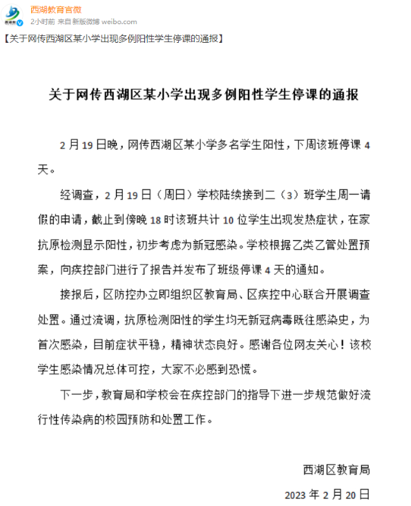 好博体育北京2月20日电 (记者孙竞)2月19日晚,网传杭州某小学多名学生阳性,下周该班停课4天。今天上午,杭州市西湖区教育局通过“西湖教育官微”发布通报。