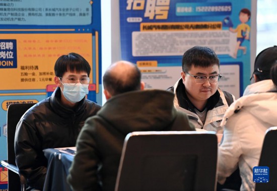 2月19日,在天津经济技术开发区春季促就业暖心行动公益现场招聘会,招聘企业工作人员与求职者交流。新华社记者 赵子硕 摄