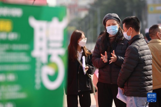 2月26日,招聘人员(左二)与求职者交流岗位信息。