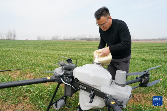 2月28日,王昌在来安县水口镇拥巷村为植保无人机添加除草剂。