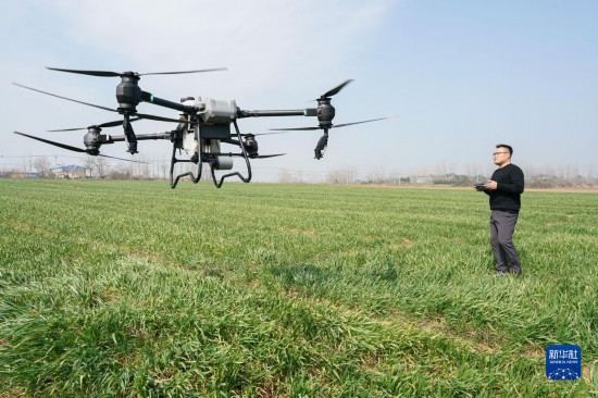 2月28日,王昌在来安县水口镇拥巷村操作植保无人机喷洒除草剂。