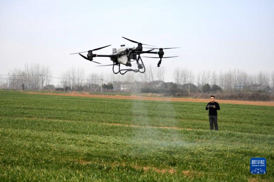 2月28日,王昌在来安县水口镇拥巷村操作植保无人机喷洒除草剂。