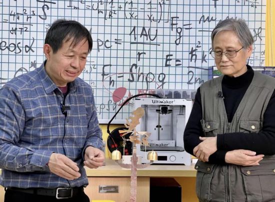 唐守平(左)与另一位退休教师交流科普实验。(受访者供图)